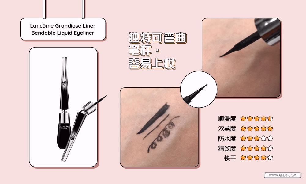独特可弯曲笔杆,让画眼线更顺手!革命性 35°旋转笔刷能完美贴合睫毛根部,不论什么角度都能顺着眼型勾勒出完美弧度。眼线液极黑抗晕配方,创造出超浓黑色泽的抢眼线条。