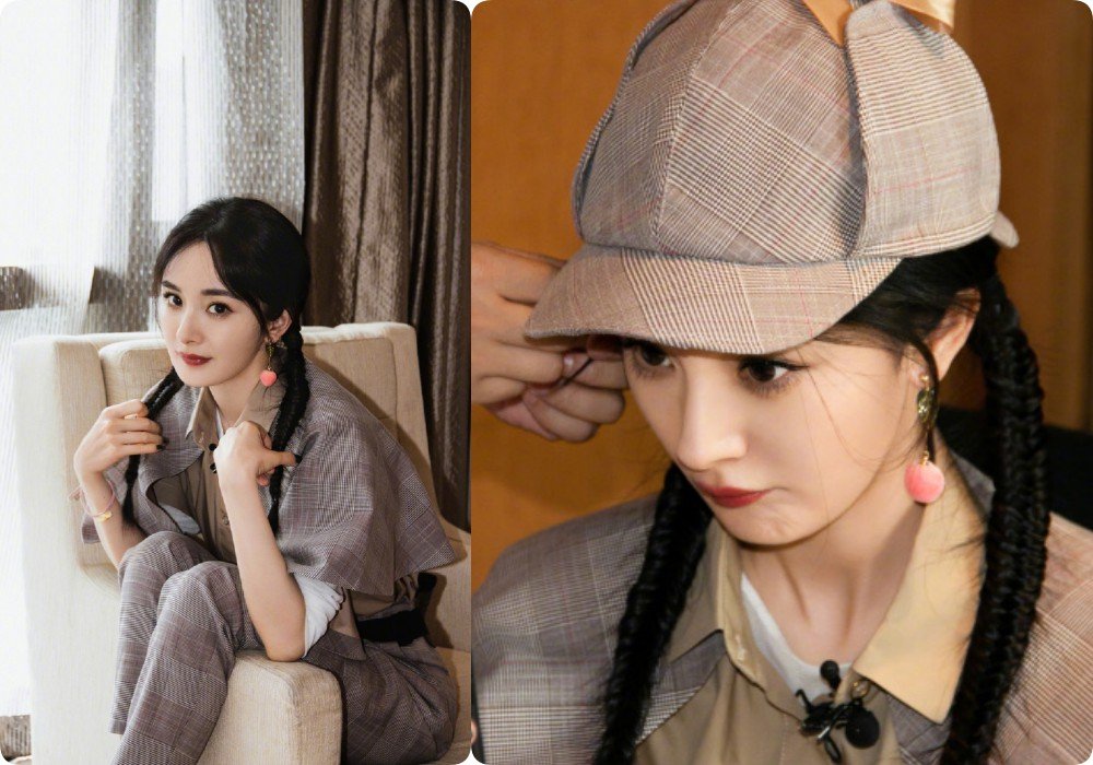 杨幂穿着咖色浅格子衬衣与西装斗篷和西装裤,再加上其同款的帽子带有小小蝴蝶结, 让整体造型显得自然活泼。杨幂的斗篷颜色是浅咖色的,但在浅咖色之中还带有一点粉色色调,让造型色彩上显得比较洋气之余,还有一丝少女感。整件套装采用的是西装质地,这种西装质地能表现出较为笔挺的效果,同时也能够减少整体造型过于可爱的隐患,让造型可爱之余又有正经。在妆发上,俏皮可爱的双鱼骨辫加上耳饰的点缀,让整个造型显得更为清新少女。