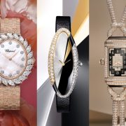 四款限量版腕表皆采用 18K 金且表径仅为 36 毫米的超薄表壳,并于表圈镶嵌长方形切割美钻。其中三款腕表饰有装饰宝石、粉色蓝宝石、绿色沙弗莱石和臻美钻石。第四款腕表则采用纯金表盘,镶饰粉色蓝宝石、紫水晶和璀璨钻石。