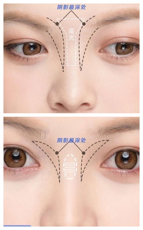 若你的山根较为扁塌,但中庭较长,阴影修容可以在眉头下方开始均匀抹开;若你的中庭比较短,阴影修容则可以从山根连接到眉头,高光部分可以从眉间三角区到鼻梁中段即可。