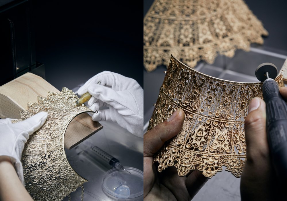 Dior D-Renaissance 配饰来自 Dior 2022秋冬成衣系列,运用灵感源自高级珠宝的精湛工艺,迷人而富有诗意。这些创意单品经过精心制作,将轻盈的蕾丝与精美的树脂珠饰和仿水晶巧妙融合,由工匠逐一手工镶嵌,彰显精湛工艺的内涵与魅力。这些让人梦寐以求的作品体现了品牌追求卓越的精神。
