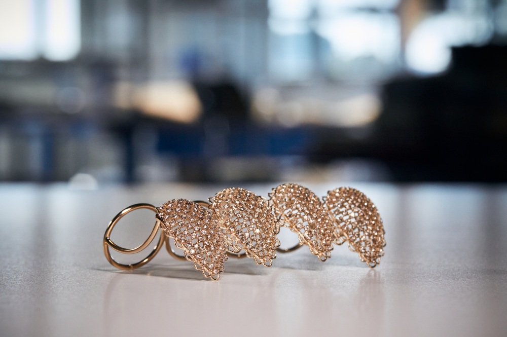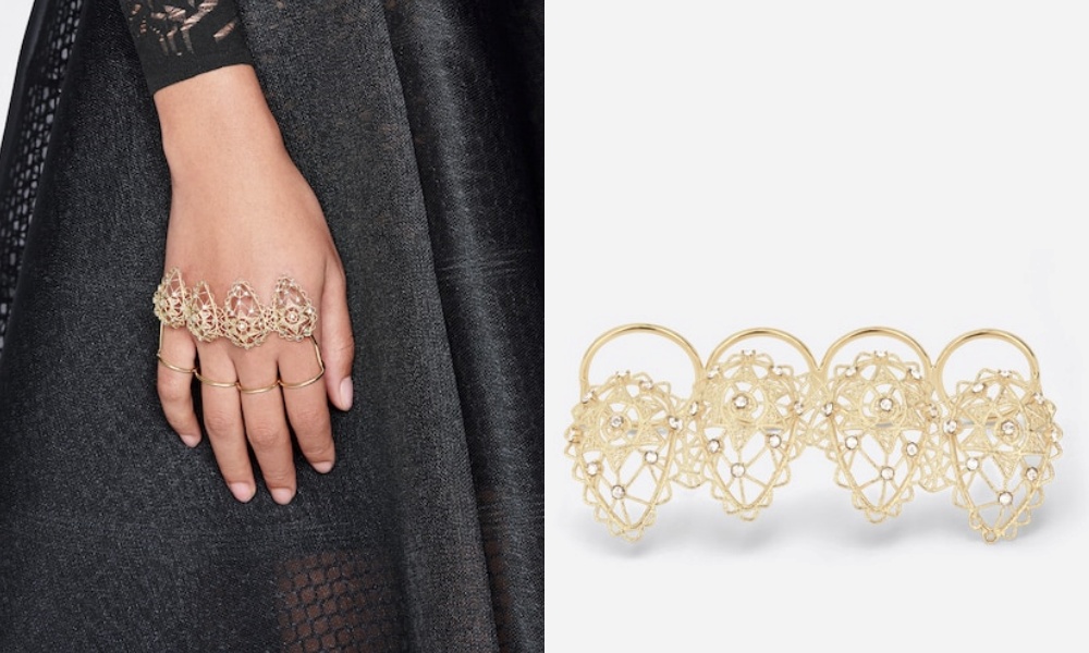 优雅华丽中多了些个性气息,这款 D-Renaissance 多指戒指从机车手套汲取灵感,突显 Dior 非凡的精湛工艺。造型别致,由金色饰面金属环组成,搭配点缀以银色调仿水晶的镂空蕾丝效果装饰,一直延伸至指尖处。