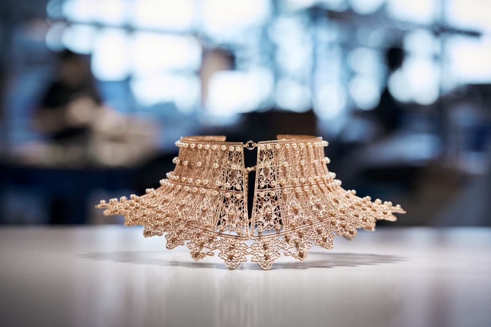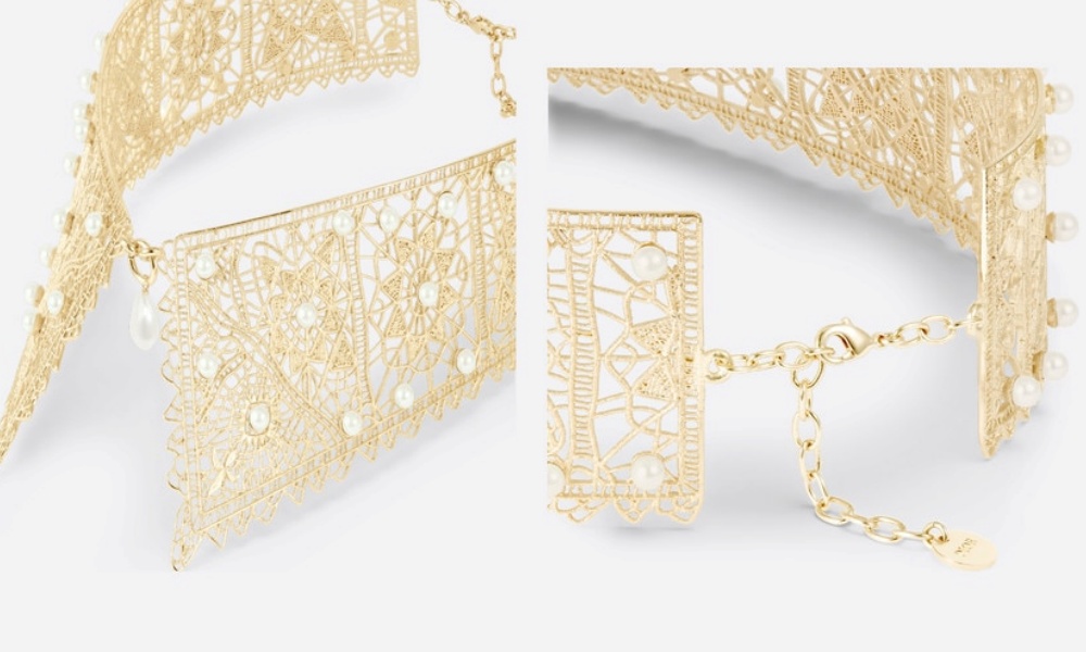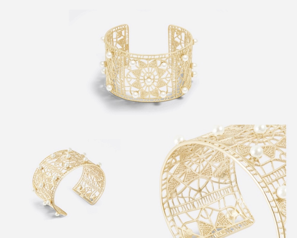 D-Renaissance 手镯采用金色饰面金属精心制作,打造镂空蕾丝效果,手工镶嵌以白色树脂珠饰。华丽而不张扬,很有维多利亚时期的魅力,可与 D-Renaissance 系列的其他单品搭配,打造高雅的造型。