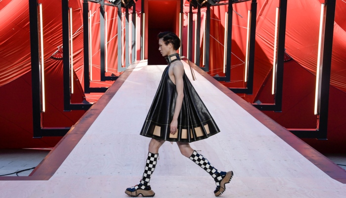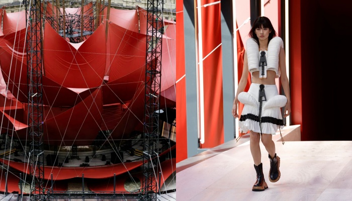Louis Vuitton 的秀场向来讲究,而且为了登上话题榜,品牌也是花了不少心力和人脉,这一次的春夏大秀邀请了艺术家Philippe Parreno以及《蝙蝠侠》的美术指导James Chinlund共同设计秀场。以当代风格的鲜艳红色大王花朵装饰艺术「绽放」在罗浮宫的中庭,强烈的舞台效果让模特和看秀嘉宾们宛如走进了科幻秀场一样,后来一看品牌大使「鱿鱼女」郑浩妍身穿未来感造型装束开场,仿佛在告诉大家这场前卫大胆的大秀开始了。