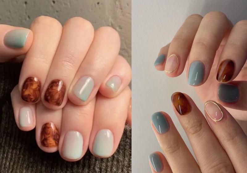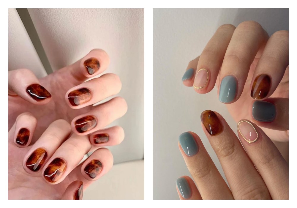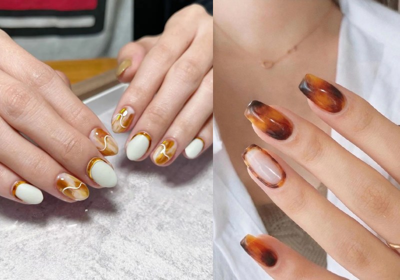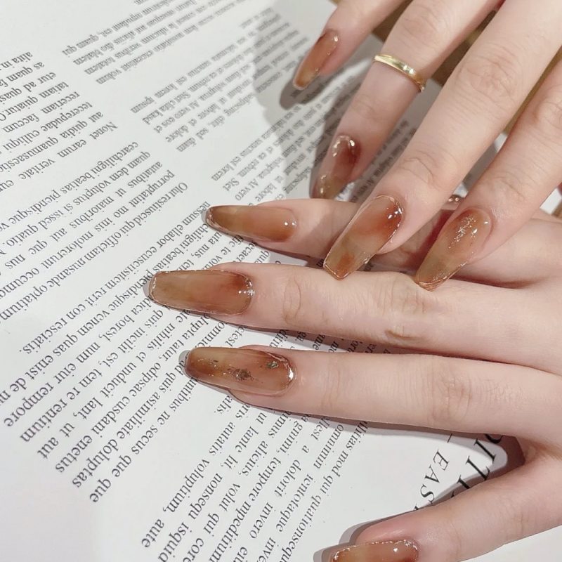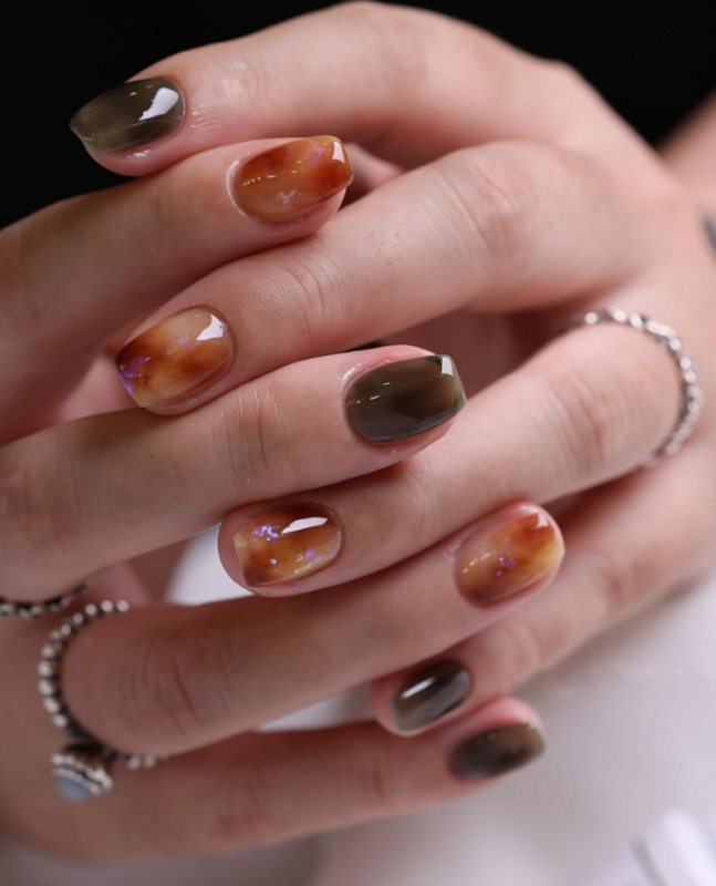 琥珀色通常呈现出温暖的橙色和深褐色的混合,透过晕染的手法,还会交织出一股优雅的法式气息。此外,这个色调真的非常适合秋季,给人带来一种温暖的感觉,与秋天的氛围相得益彰,低调得来又不失设计感,上班族也可以安全驾驭。
