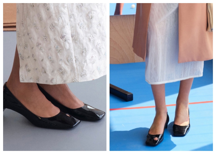 鞋履的设计包括了露趾高跟鞋,这也是2023年秋季的热销款,如今以经典的黑色、米色回归;另一款让人感到极有兴趣的绝对是方形鞋楦以及被开了「切口」的高跟鞋,原本复古典雅的风格被增添了一丝幽默和古怪;畅销的芭蕾平底鞋也用了榛子色的T字母单宁提花呈现。