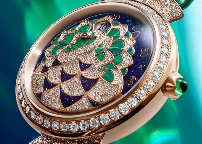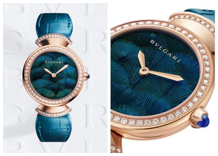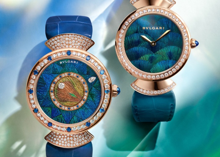 Bulgari 的Divas‘ Dream Peacock Feather Marquetry腕表旨在赞颂蓝孔雀与生俱来的华美羽毛,在表盘上能看见的12扇羽毛的绽放,其中「眼状花纹」更是智慧的代表。这些羽毛都是从孔雀自然掉落的羽毛中获得,对羽毛的色彩和纹路都经过精挑细选,尔后再利用古老的细工镶嵌技艺将其镶嵌于表盘上。尽管这个过程使用的自由放大镜、镊子、剪刀、小刀等简单的工具,但每根羽毛都经过黄铜蒸汽机的处理,给予羽毛自然光泽、加上切割、组装,才能形成完美闪耀着绸缎光泽的马赛克图案。