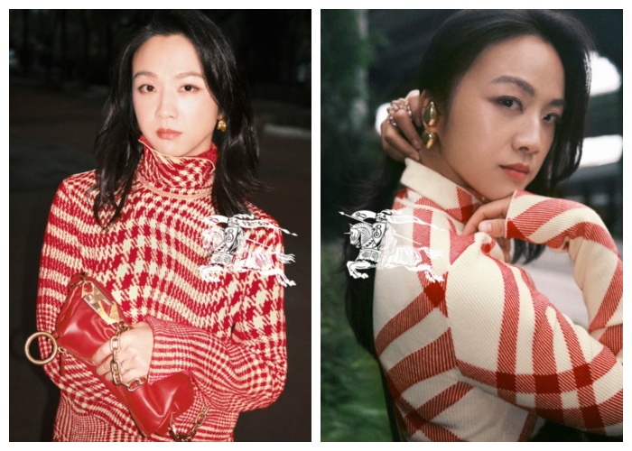 刚和汤唯、陈坤「确认关系」没多久的Burberry,当然要让俩人入镜演绎,同时也邀请了超模贺聪、王相国以及Alex Schlab齐聚在四川成都,由摄影师Ryan McGinley掌镜一系列影像。汤唯一张侧身面向镜头,身穿红色格纹服装,秀出了耳畔的金属耳环;另一套服装则是红色千鸟格纹高领连身裙,手拿的是话题度很高的Knight 手拿包,还是喜庆的红色。