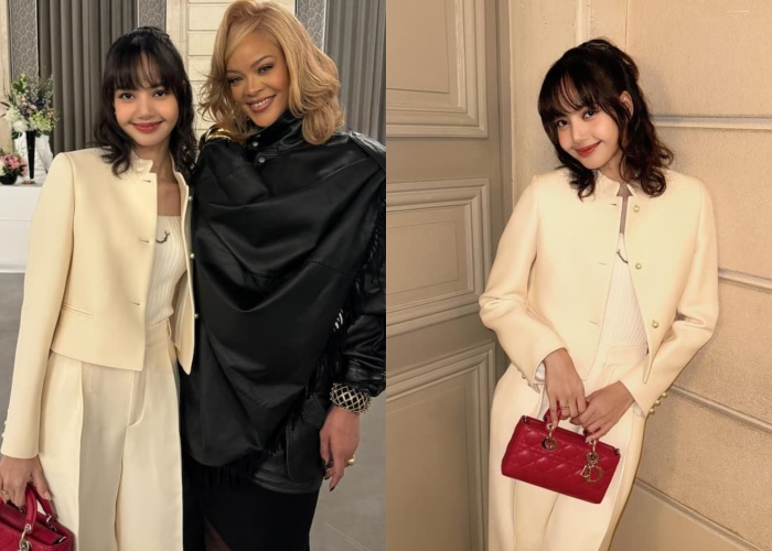 Lisa在近日的Le Gala des Pièces Jaunes慈善演出期间,身穿Dior的白色套装,手拿的还是Dior Lady D-Joy红色小提包,还和Rihanna合照;另外,和法国第一夫人见面时,一样穿上了全套的黑色Dior,搭配Dior高筒靴,其中绗缝设计细节的衣裙让Lisa看起来十分活力俏皮。