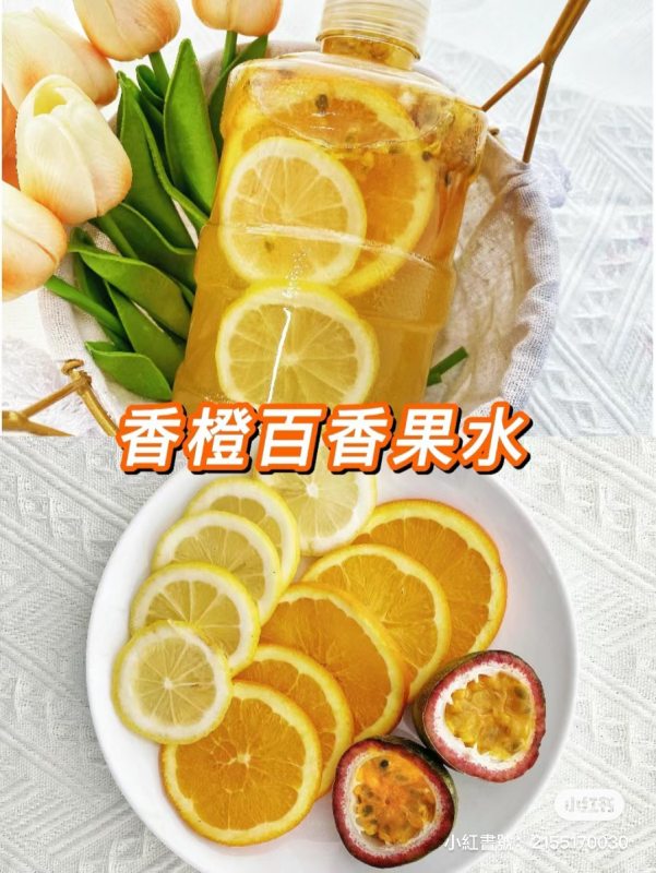 香橙百香果水,由橙子、百香果和柠檬制成,富含维生素C、抗氧化物质和膳食纤维,通过促进免疫系统、清除自由基、促进消化系统健康,有助于排毒和减轻水肿问题。