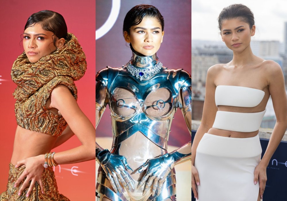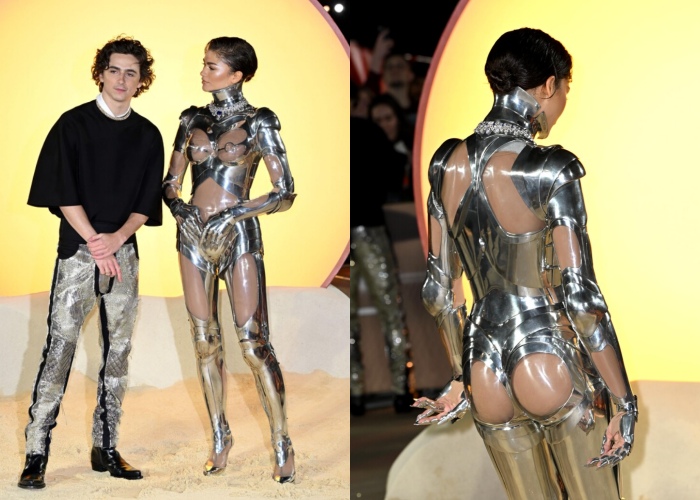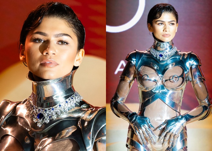 好一阵子没露脸红毯的Zendaya,近日为了新电影《Dune 2》宣传,她也不负众望再一次解锁了新的绝顶造型。首场和甜茶Timothée Chalamet 亮相时,Zendaya穿上Thierry Mugler 1995年秋冬高订的银色机械装,由金属盔甲和透明壳包裹身躯,搭配Bulgari的顶级珠宝项链Barocko,和带有科幻色彩的礼服华丽结合,让Zendaya化身闪耀非凡的女战士。