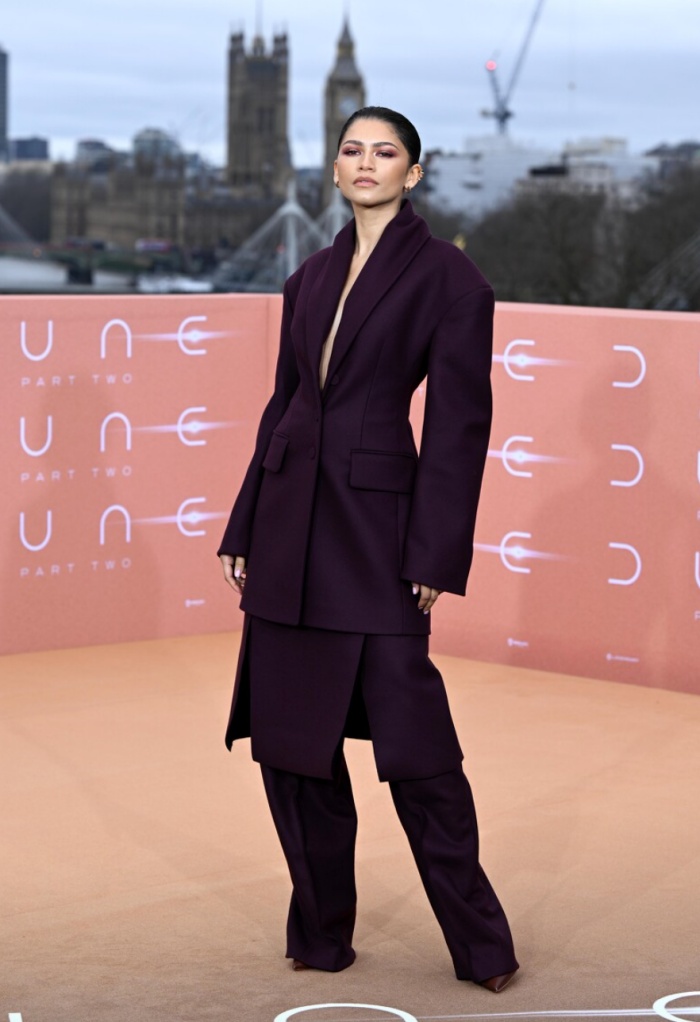 在伦敦的宣传活动上,Zendaya稍微让人的目光休息一下,穿上的是Roksanda Ilinčić的深紫色套装,虽然包紧紧,但还是展现了她修长的身型轮廓。