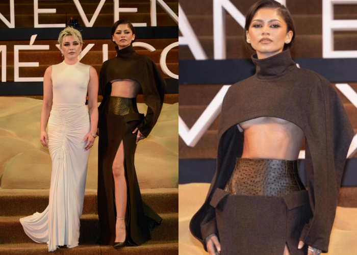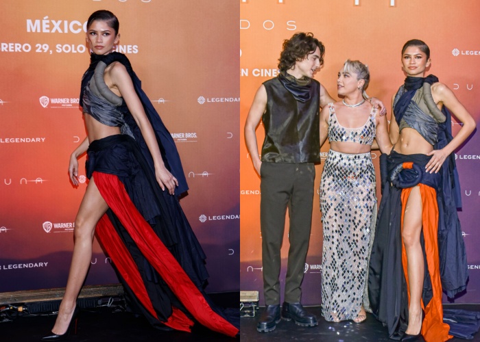 在墨西哥的宣传上,Zendaya的服装依旧抢镜,身穿英国小众品牌Torisheju,拼接设计细节,和垂坠的面料,带来了很符合电影意境的末日感,这新颖的服装也给这个设计师品牌增加了不少的曝光率。隔天Zendaya再穿上Bottega Veneta的秀服,特别改成中间镂空,露出了紧实的腹肌,性感和气场两样都有!