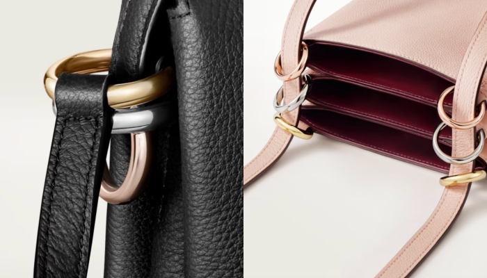 适逢迎来Trinity系列戒指100周年,Cartier也推出一系列以Trinity为灵感的新款手袋,无论是竖款、长方形肩背包或是皮包,都以简约的设计和柔和的石英色调为主,其中特色就是以金色、白金色和玫瑰金呈现出三色环圈,点缀在提手处,和粒纹小牛皮相得益彰。