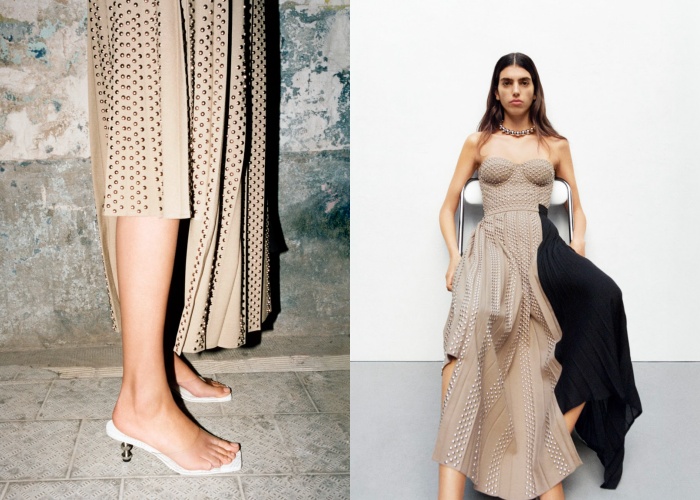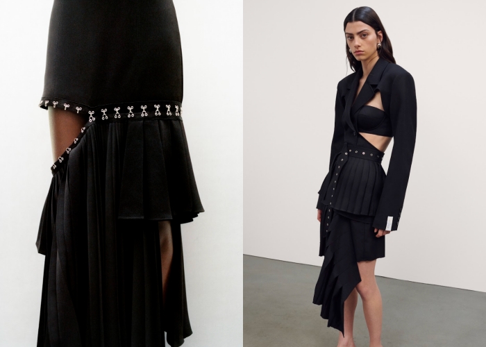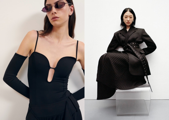 这一次的合作系列绝对不会少了Rok Hwang的标志性结构、重组和不对称设计美学,一共打造了58款男女装与配件,包括可拆解的男女士双层风衣、腰部镂空的西装式连身裙、不对称的黑色小洋装、点缀满银色铆钉的西装外套、斗篷设计皮夹克等,都是在Rok Hwang追求不退潮流的想法下诞生。至于配件方面,有厚底的Derby鞋、真皮双腰带、透明高跟凉鞋、风琴式文件包、复古皮质公事包等,都糅合了玩味和大胆的气息。