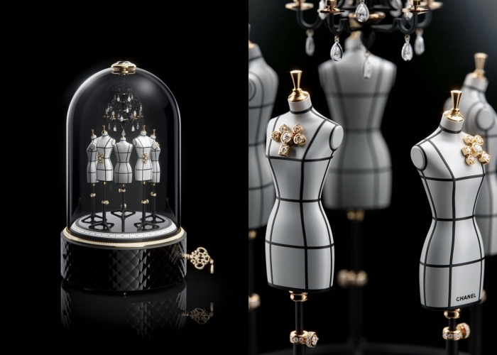 这次Chanel带来的钟表作品有很多,但这作品必须先提一提。从Gabrielle Chanel高订工作坊的日常为灵感,带来了Chanel Couture Workshop音乐座钟,在圆顶玻璃里井然有序排列了5个点缀上黑色皮革缎带和18K黄金美钻的天然铝陶瓷半身像。至于如何读时?那就要细心看玻璃罩下的卷尺,就能知道答案。