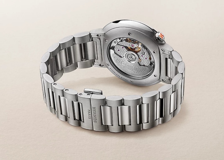 由数枚圆形元素集合的Hermès Cut有着适合大多数人手腕尺寸的36mm表径,明显表现出Hermès对这款表的中性定位。仔细看会发现Hermès Cut的表冠设置在1点30分的位置,十分有辨识度,表盘上以立体阿拉伯数字时标,棒状指针经过部分还特别做出了镂空设计。Hermès Cut搭载品牌自制H1912机芯,金属链带以外形圆润的链节组成,和表壳相呼应,而且备有快拆系统,可自由更换表带转换风格。