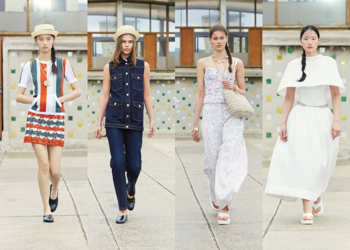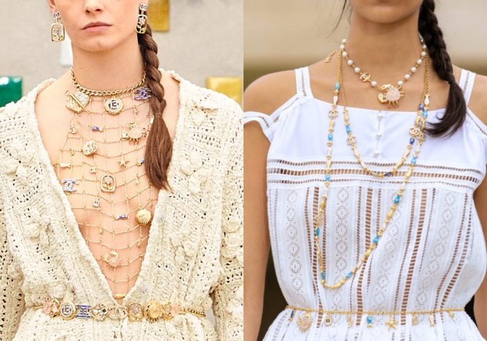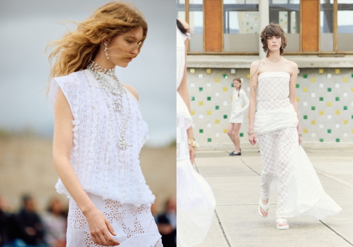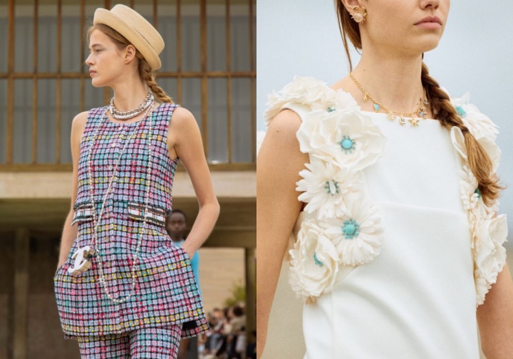 Chanel引以为傲的斜纹软呢面料当然没有缺席,但是仔细看还有不少体现了Chanel工作坊精致技术的细节,例如口袋上致敬马赛公寓的几何图案、细腻拼接的蕾丝、立体的花朵设计等,都在实穿性的服装里展现工坊技艺的浪漫。另外,Virginie Viard的可爱浪漫小心思用在了小细节里,让贝壳、珍珠、海星、小螃蟹、渔网等,运用在项链、手链、手袋上,都是让人思绪秒飘逸到海滩上的度假符码。