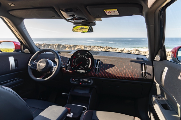 在内部设计方面,MINI Countryman 的车厢设计与全新 MINI Cooper 没有太多差异,同样取消了传统的仪表盘,采用抬头显示器(HUD),一样配备了新的圆形主机,屏幕覆盖整个圆形边缘,运行的也是最新的 MINI 操作系统 9。