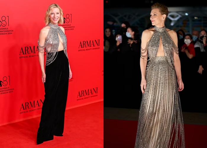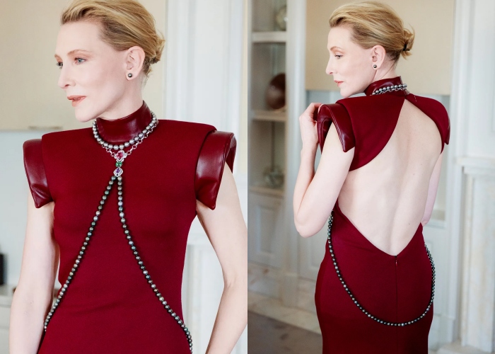 Cate Blanchett 这一次似乎特别和珍珠特别有缘分,她在红毯上穿了另一套来自Armani Privé 2024秋冬高订系列套装,前面有醒目的低胸设计,但其实背后才是亮点,在Cate Blanchett一转身时会看见背后的珍珠串链,散发着的是优雅的光芒。