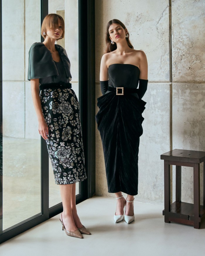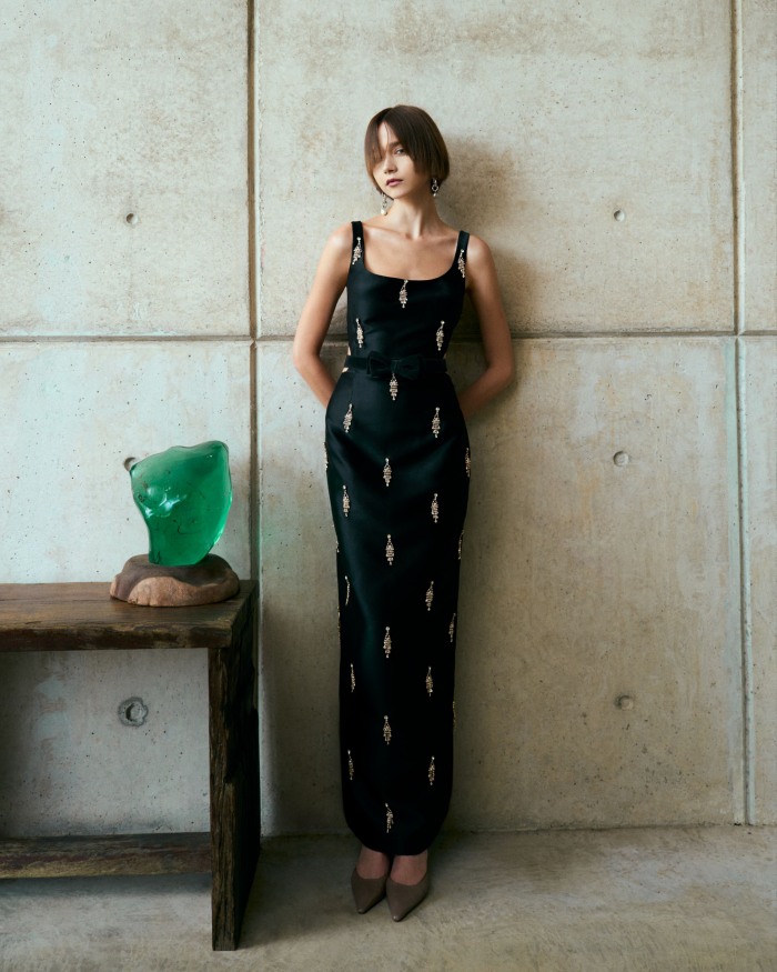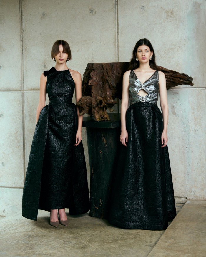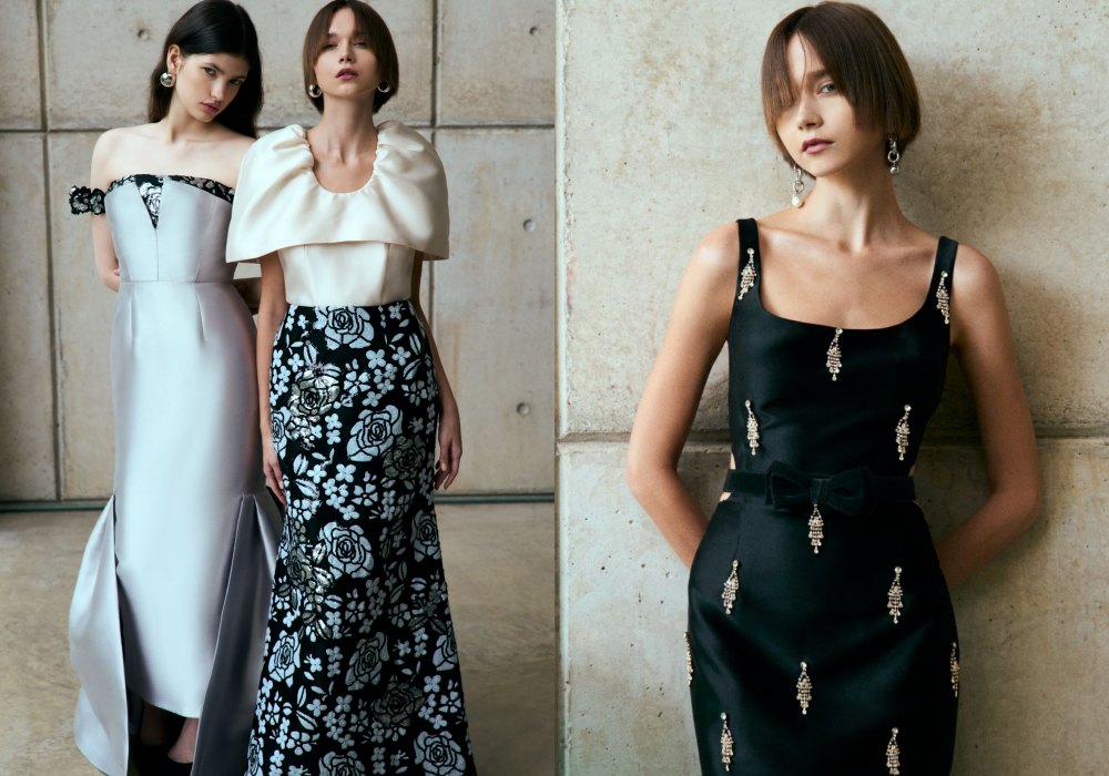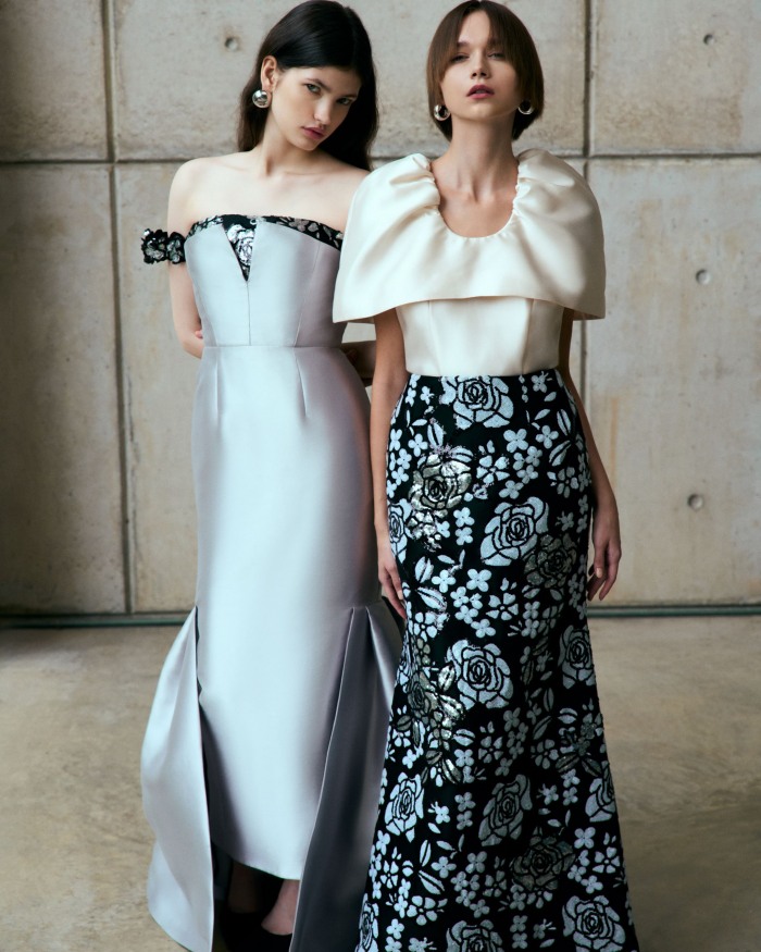 在色彩方面,两大主调成为焦点,分别是用黑色和海军蓝等深色调增强优雅气质,而金色、银色、香槟色和芥末色等丰富的色彩则注入了一丝奢华感。此外,Khoon Hooi标志性的Wallis蓝继续在该系列中亮相。