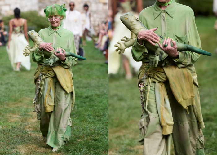 Collina Strada的品牌设计师Hillary Taymour 邀请了72岁的纽约网红Green Lady of Brooklyn手抱蜥蜴包走秀,像是呼应荒诞田园风格,但实情是在传递地球上发生的种种自然灾害,以及对AI飞速发展的思索。
