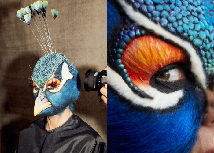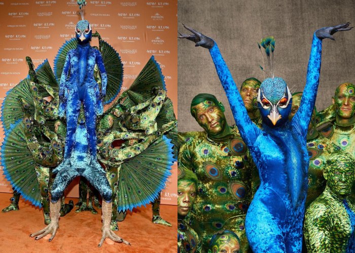 这一次Heidi还拖来了帮手,一起组成了孔雀开屏的主题。而且是经过了6小时才完成,她顶着的孔雀头是找来知名特效化妆师Bill Corso帮助完成,仔细看会被这栩栩如生的细节给惊艳,这可是Heidi Klum的决心!