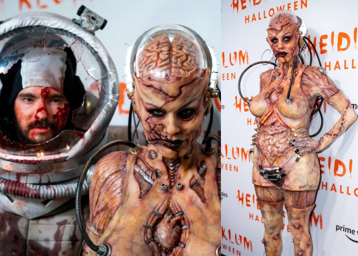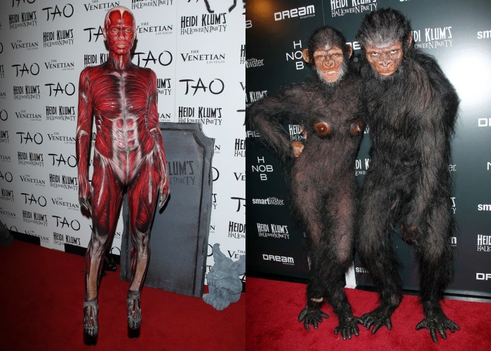 这一年的Heidi连续带来了两个装扮,一个像《进击的巨人》走出来那般的剥皮人;另一个这是和先生一起扮演了猿猴,实在很逼真。