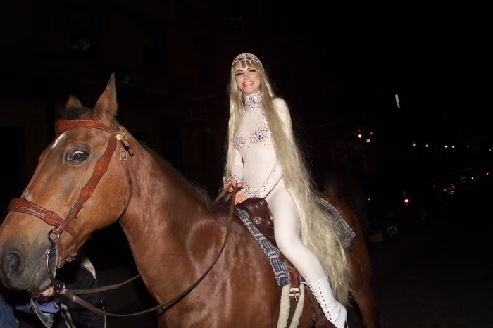 吃过Godiva 巧克力的人应该都对logo特别有印象,原来这也是Heidi在早期万圣节装扮的灵感之一。当时她还是骑着一匹活马进场,似乎是她开始成为「Queen of Halloween」的开端。