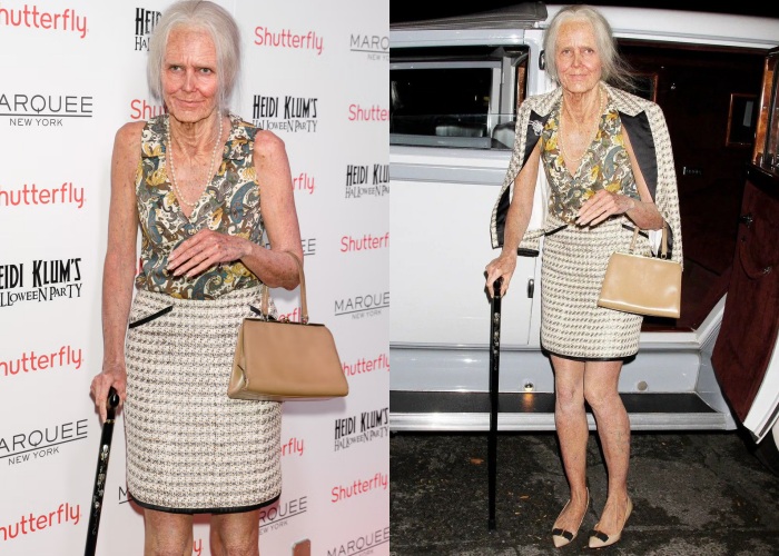 Heidi Klum在2013年的时候,没有选择装扮成别人,而是扮成年老后的自己(可能是80岁的自己),而且为了营造出逼真感,她和化妆师团队对脸上的皱纹、色斑都花了很多心思,那些纹路、青筋等都全身上下完整表现了出来。