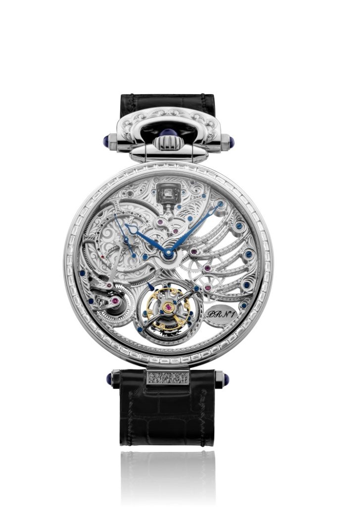 这是品牌有史以来首次推出的全镂空设计,拥有令人惊叹的透明度,每块底板、桥板、和其他表面均采用纯手工雕刻,机芯和专有的「书写斜板」式表壳,采用获得专利的双面飞行陀飞轮、球形上链系统等精表工艺,还有10天的动力储存。