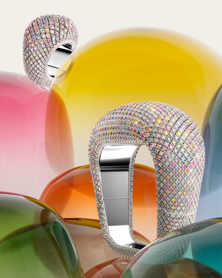 延续了Coussin腕表设计的戒指和手镯,均在表面上铺镶各种罕见蓝宝石,营造出柔和的单粉色彩,令作品散发感性迷人、目眩神迷的惊艳美感,以独到风格彰显品牌的创意巧思。