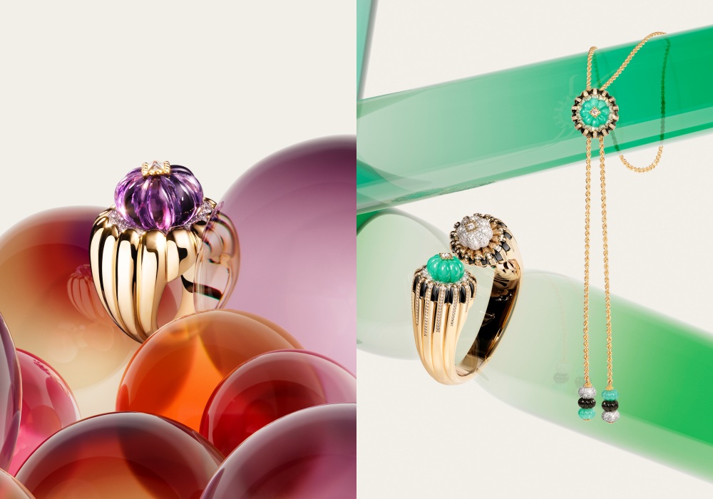 以槽纹和立体雕刻形成的瓜型紫水晶、绿玉髓造型,外形丰盈饱满,镶饰在戒指、手镯和项链之上,令人心醉神迷。Cartier也在瓜型宝石上点缀上钻石,再与缟玛瑙、黄金、铺钻为立体结构注入生动律动,缔造华丽珍贵质感。这一系列匠心杰作,也是向Jeannse Toussaint与其对立体黄金结构的美学品味致敬。