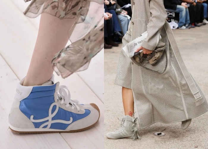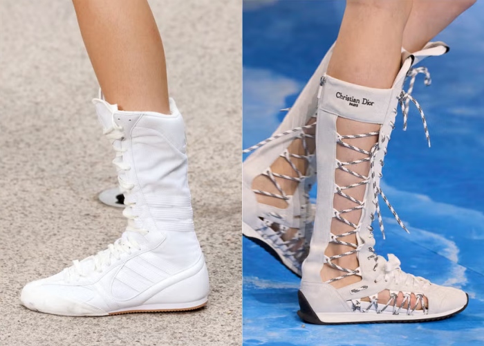 有好好做功课的时尚人相信应该已经发现不少品牌的2025春夏里,已经出现了拳击鞋的踪影。像和adidas感情要好的Stella McCartney已经和adidas Rasant合作联名鞋款,以Monza系列鞋款为基础,带来的拳击鞋更符合现代柔美的美感要求;身为拳击迷的Loewe创意总监Jonathan Anderson也在春夏2025系列中带来了一款中帮的拳击鞋,而且结合的还是钢琴元素,鞋侧用的是音符呈现品牌logo,充满诗意;从女战士装束中获得灵感的Dior,也特别借鉴了拳击靴的高帮板带细节,打造镂空设计的绑带靴子,将竞技运动基因融入其中。