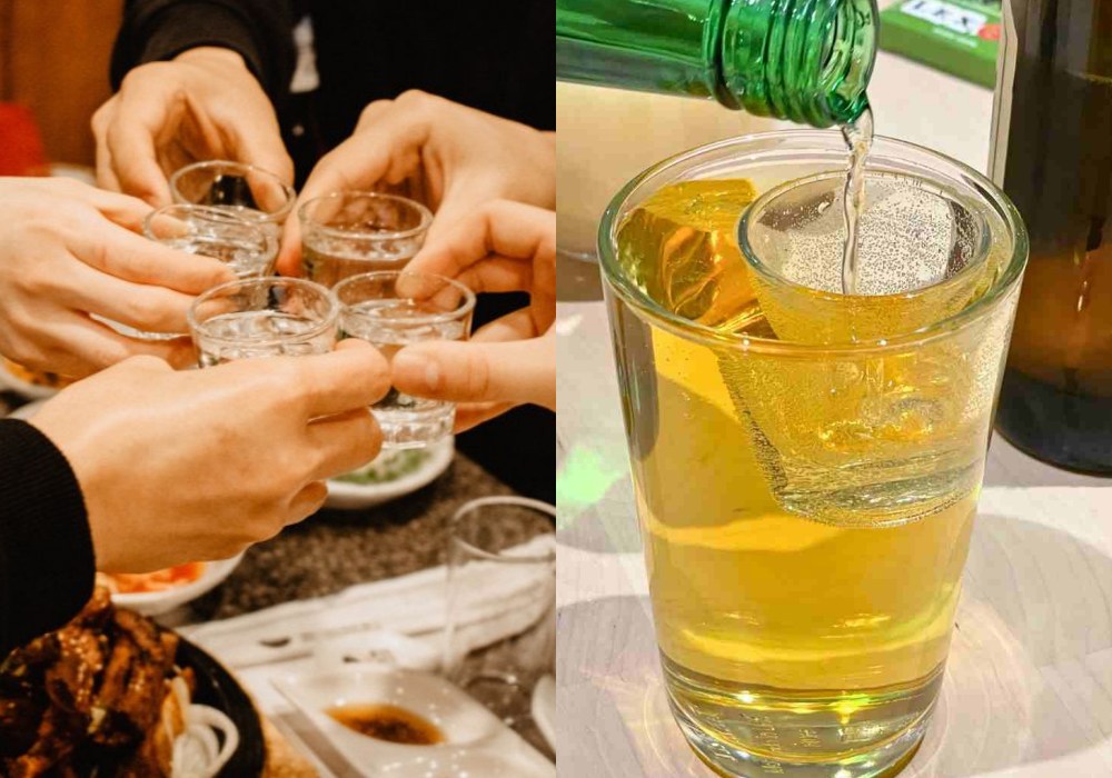 这是一个经典的韩国喝酒游戏,通常用烧酒和啤酒来玩: