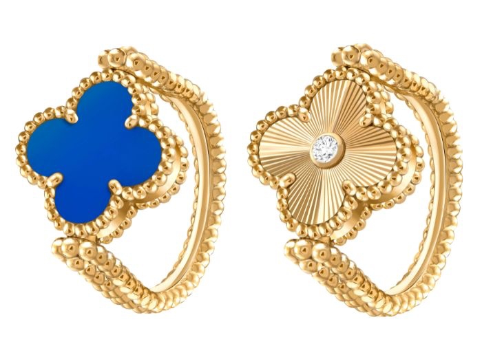 Vintage Alhambra可翻转戒指,分别饰以镶嵌美钻的玑镂雕花黄K金和蓝玛瑙,两面均点缀了精致的圆珠饰边,活动铰件也确保了稳定流畅的反转体验,玑镂雕花黄K金表面还特别镶嵌了一颗封闭式钻石,既光彩但也不影响佩戴体验,而连指内圈也经过细心考虑,彰显世家的用心。
