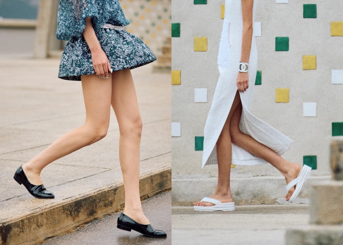 依循度假的氛围,毛巾布材质点缀的凉鞋成了鲜明的单品选择,还有可以能维持优雅和休闲的双色低跟鞋、粗跟鞋款、楔型鞋等,还有方便穿脱的芭蕾舞鞋等,都是在度假里应付各个场合的选择。