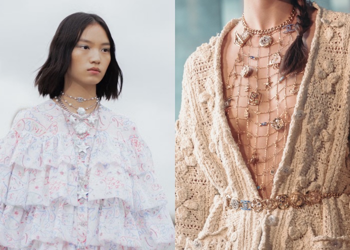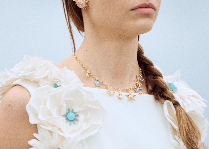 既然选在马赛这座海滨城市办秀,当然少不了呼应海洋元素的作品。于是能看见可爱的小鱼、海星、螃蟹、珍珠等海洋元素的符码藏入首饰设计里,其中最让Q编印象深刻的就是渔网状的项链,将一些关于海洋和品牌的美好与浪漫,都「一网打尽」。