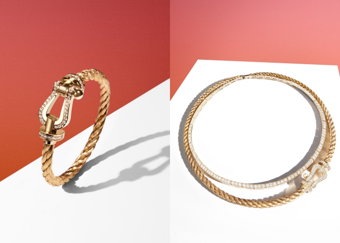 Force 10系列的灵感来源FRED创始人Fred Sameul先生发现他的长子将编织的缆绳固定在勾环两端,制成了一条手链送给了他的妻子作为礼物,这也激发了他重新设计了水手结的双扭结结构,并增加了一条黄金链扣,赋予了设计更多细节,是充满爱与联系的作品。