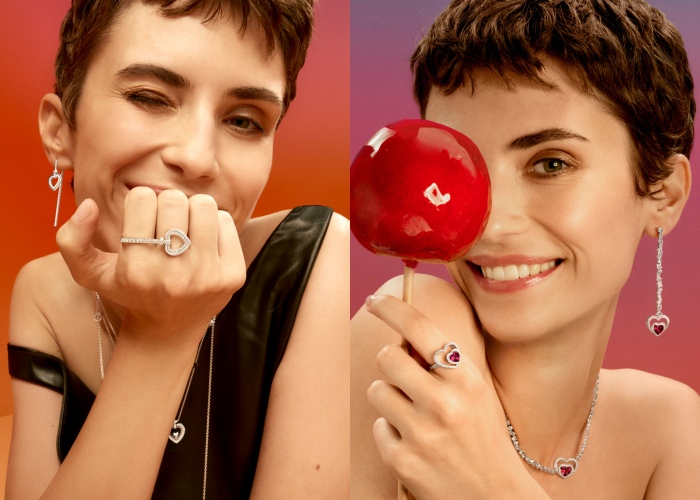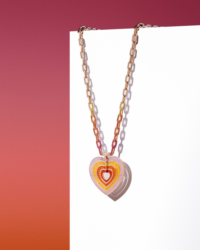 全新作品以更为璀璨的材质延续标志性设计,优质的钻石和彩色宝石构成双面可旋转心形,缔造迷人的爱情护身符。 每颗心形吊坠的一面铺镶澄澈钻石,另一面饰以粉红蛋白石,黄玛瑙,橙玉髓和红珊瑚,通过巧妙设计,其中每一枚吊坠都可以进行翻转,从而创造出16种不同的外观组合,用于搭配不同的场合和穿着,从各个角度诠释独特爱意。