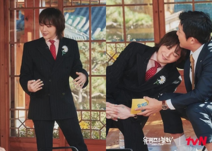GD上综艺节目可真的相当罕见了,日前上了韩国知名主持人刘在锡和曹世镐的节目《刘Quiz On The Block》,特别穿上了少有「正经」的西装,仔细看会发现特别搭配Jacob & Co的小雏菊胸针,搭配Chanel 5号戒指和红色领带,整体表现正式但也少不了自己热爱时尚的个性。