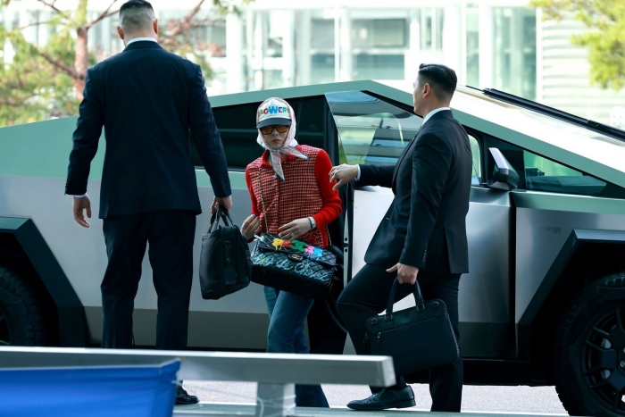 为出发到香港参加Chanel度假系列巡回时装展的GD,乘坐Tesla 的Cybertruck亮相就已经引发热议,但下车后因为头上顶着小方巾,让不少人摸不着头脑了。看起来随意,其实仔细看都是精心搭配的,头上戴着的棒球帽刺绣着的是新歌《POWER》的名字,搭配的碎花小方巾来自Chanel,为造型增添了不少趣味性。