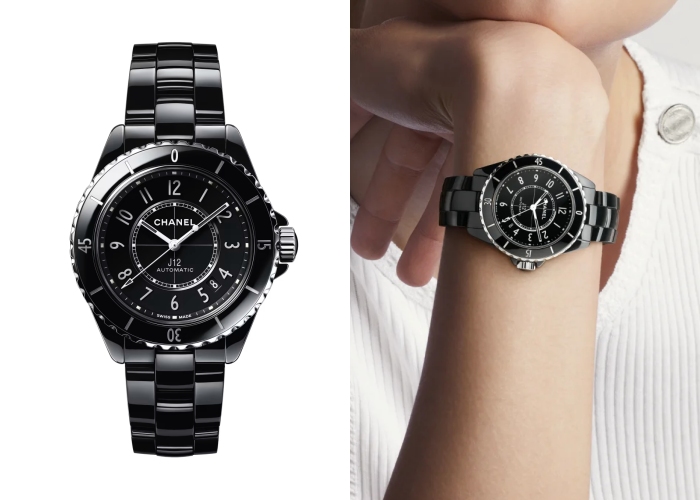 Chanel的J12 Caliber 12.1表款采用高科技精密陶瓷与精钢相结合的表壳,佩戴感既轻盈又耐用。黑色或白色的陶瓷材质赋予腕表深邃或纯净的外观,搭配精钢表圈,展现出运动与优雅的完美融合。腕表的表盘设计简洁大方,时标和指针清晰易读,视觉上有设计感但不复杂,尤其选择黑色款式特别好迎合男女各种场合穿搭。