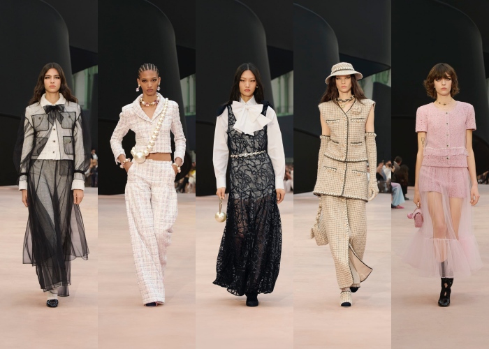 在Matthieu Blazy正式接手Chanel之前,品牌工作室操刀的2025秋冬系列,交出了一个「非常Chanel」的大秀。从秀场就搭建了一座巨大的黑色缎带舞台,致敬Coco Chanel的经典符码。服装上也延续品牌DNA,包括缎带、蝴蝶结、珍珠、斜纹软呢、花朵,将大家一切热爱的、熟悉的Chanel元素都展现了出来。