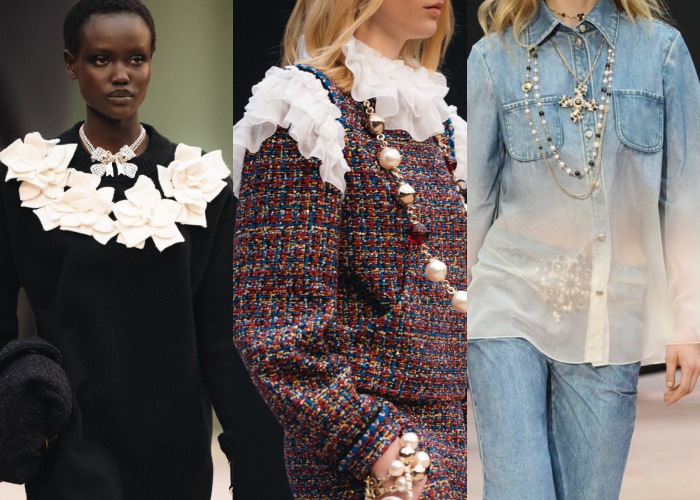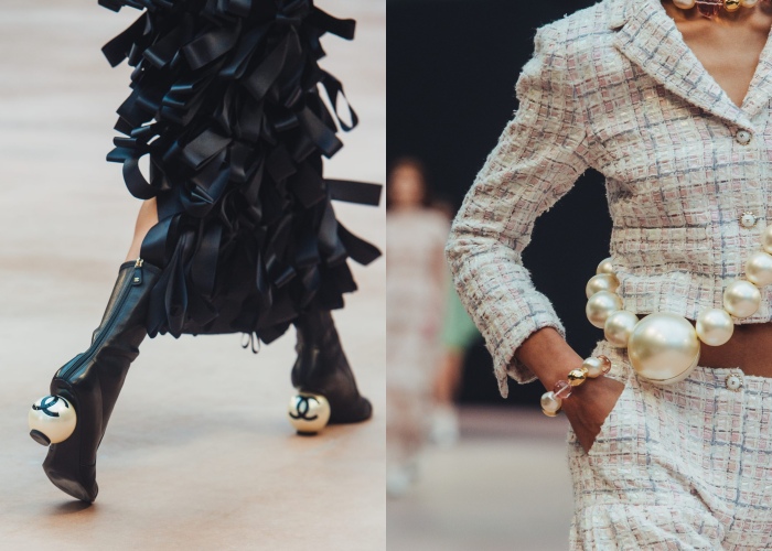 其中经典缎带更是被运用到极致,无论是颈间、印花、亮片刺绣、针织甚至发饰都能看到缎带踪影;另外Coco本人喜爱的荷叶边也大量点缀在裙摆、领口出,尽显法国女人的浪漫,就说熟悉品牌的还得是背后的设计团队。让编辑眼睛闪闪发亮的少不了那些被「放大」的珍珠手袋、珍珠鞋跟和珍珠项链,美得让人想拥有。