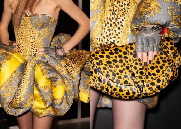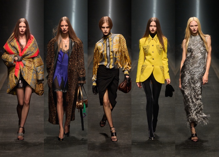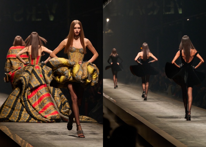 Donatella Versace受到哥哥Gianni Versace私邸室内美学的启发,将新古典主义和当代美学融合。女装系列以戏剧化笔触呈现雕塑感廓形,并融入庞克风格,将品牌典藏的轮廓、印花、材质等都大胆解构,重构出一种新世代的设计语言。