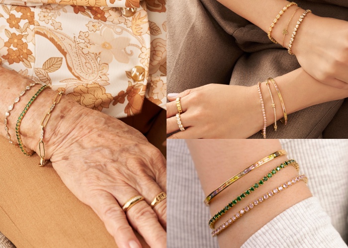另外,Wanderlust + Co也带来了多款设计感十足的设计,像可爱的纽结饼(pretzel)、镶嵌一排精致的腮红方晶锆石的网球手链和手镯等,均已14镀金提升其优雅光泽度和耐久性。其中爪子网球手链还特别采用水晶冠状设计,能防止首饰挂到细发或衣物上,特别适合作为日常叠搭,在手腕上散发浪漫光芒。
