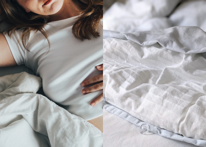 如果说衣物沾染到的话,我们还能轻松取下清洗清理,但床单、棉被或是床褥应该怎么办呢?那就要借用一点外力的帮忙了,如果只是刚碰上经血的话那就好办,立刻用干纸巾加湿纸巾快速清理,先用沾湿水(不滴水)的纸巾压在经血那一面,另外用干的纸巾放在床单的另一面,然后慢慢按压就能看到血渍会被干的纸巾吸收,可以反复两三次就能处理干净。