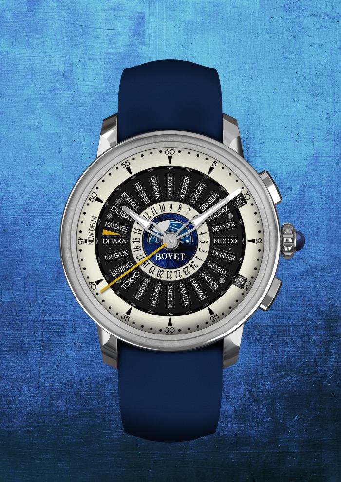 Récital 30世界时间系统:(24个城市滚轴、1个时间区滚轴、1个世界时间滚轴)各具四个位置,皆由表壳右侧的按钮控制,对应UTC、AST、EAS和EWT。按下顶部按钮可使每个滚轴旋转90度,确保24个时区对应一年中的四个时间模式。底部按钮则每次按压可推进中央24小时世界时间盘一小时,使全球时间的设定变得极为简便。