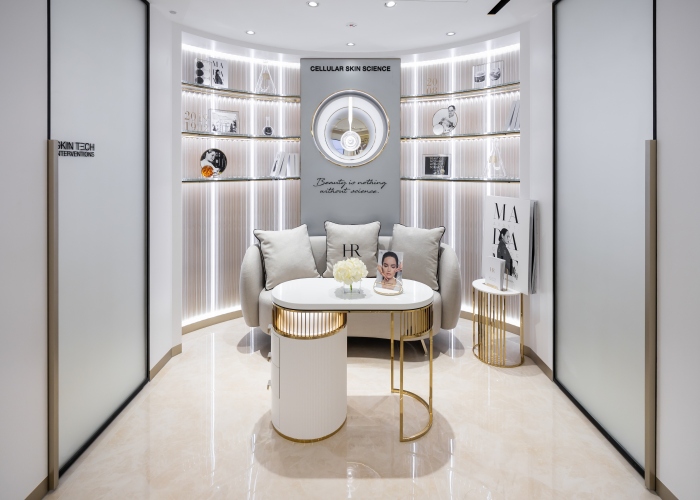 店内划分为三个不同的区域,包括展示标志性产品区、提供皮肤分析和护理区、以及传承专区,旨在纪念品牌创始人Helena Rubinstein夫人的开拓精神和对科学美容力量的坚定和信念,在这里也特别展出新加坡艺术家B.Jane Cowie的玻璃吹制艺术品。